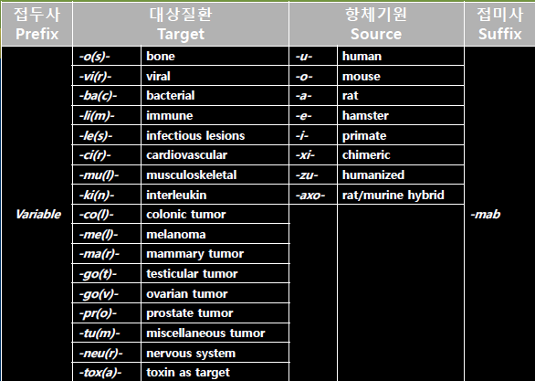 아래는 끝에 붙는 -mab 외에도 참고해볼만한 항체치료제 명명법이다.