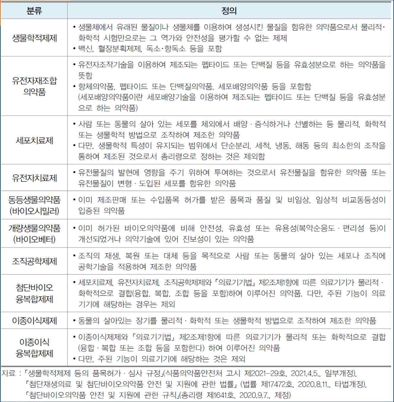 아래는 식품의약품안전처에서 제공한 바이오의약품의 분류와 각 정의이다.
