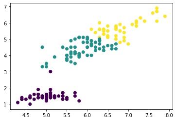 plt.scatter(x=irisDF['Sepal.Length'], y=irisDF['Petal.Length'], c=pred)